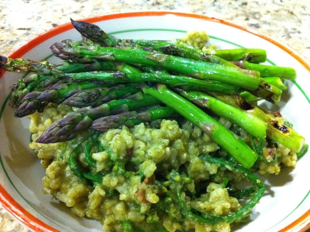 I keep a cast iron grill pan on the my stove all the time to quickly grill up veggies and tofu. We hardly ever use our barbecue anymore since I bought this pan because i find clean up to be so much easier. It helps that i have a 6 burner gas cooktop (72000 BTUs…insert Tim Allen grunt here). I grilled up the asparagus with a spray of oil from my Misto sprayer (a great find at Costco in a 2 pack).