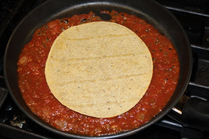 I usually like to make a quick enchilada sauce, but I was short on time tonight, so I poured some salsa into a nonstick pan until it heated up and then soaked the tortillas until they were soft, moist and flavoured all the way through. I use this trick when making enchiladas as well – it makes all the difference.