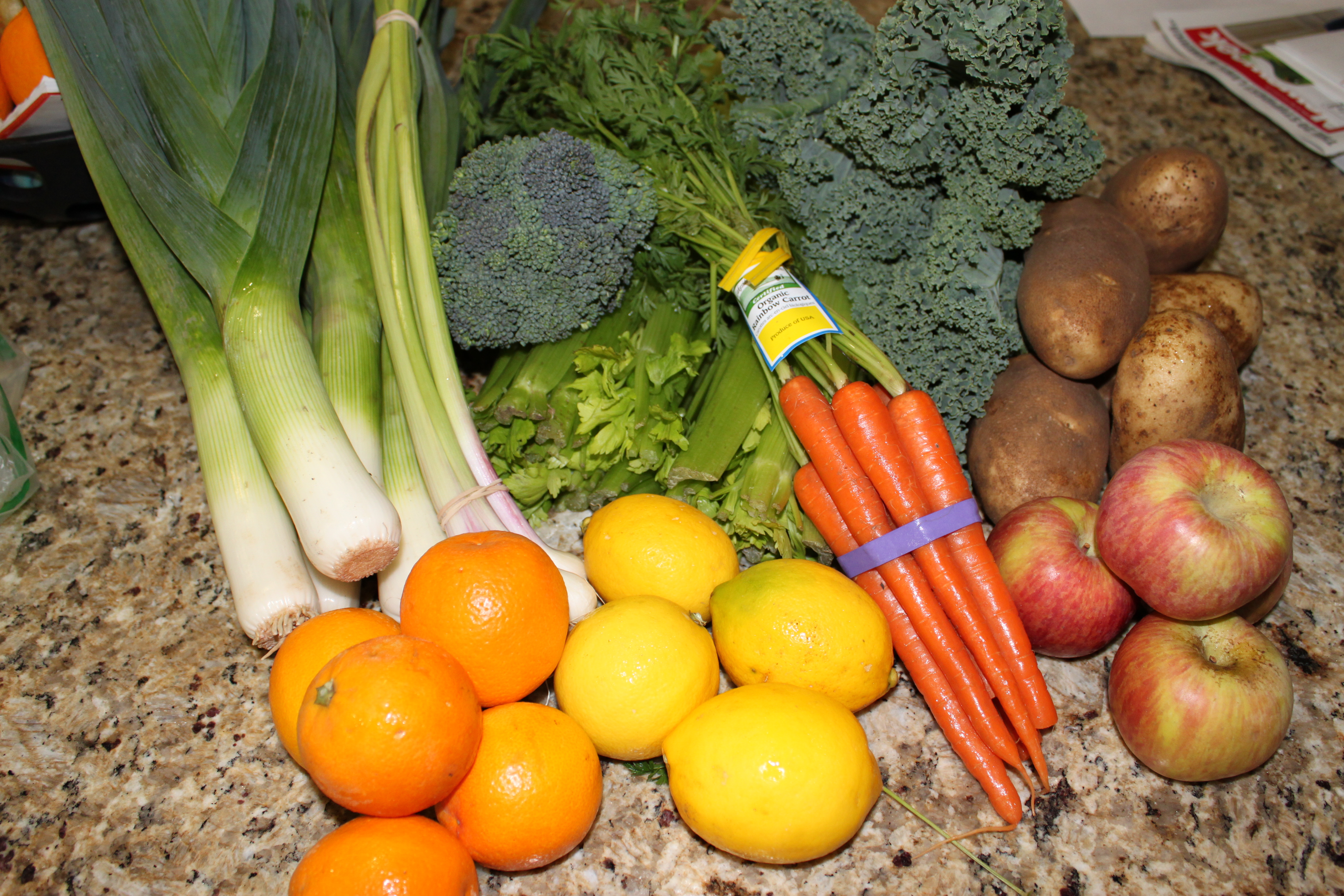 This week’s delivery included leeks, baby broccoli, celery, kale, potatoes, carrots, green garlic, fuji apples, oranges and Meyer lemons.