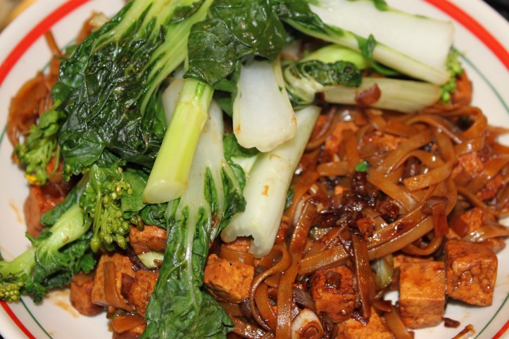 So back to Deborah Madison – her book “Vegetarian Suppers” has a recipe for Tofu and Mushroom Noodles. I was out of mushrooms, but did have Chinese broccoli, so opted to use that instead. The most interesting part of the recipe was that she recommended simmering cubed tofu in salted water for 2 minutes and then draining prior to adding to the stirfry. I loved the chewy texture of the tofu after this technique, and it did not fall apart in the stir fry afterwards either. I love new tofu techniques!