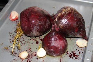 The first step in his recipe called for roasting beets in the oven with some shallots and rosemary (yay! I got to use the rosemary that has been growing beautifully in my garden). He recommends making a foil pack with all the ingredients in it and roast the beets at 400 degrees F for 40 minutes. In typical form, I was out of aluminum foil (who runs out of aluminum foil?!?!), so I made do with some parchment paper. Here’s a picture of the end result of the roasted beets.