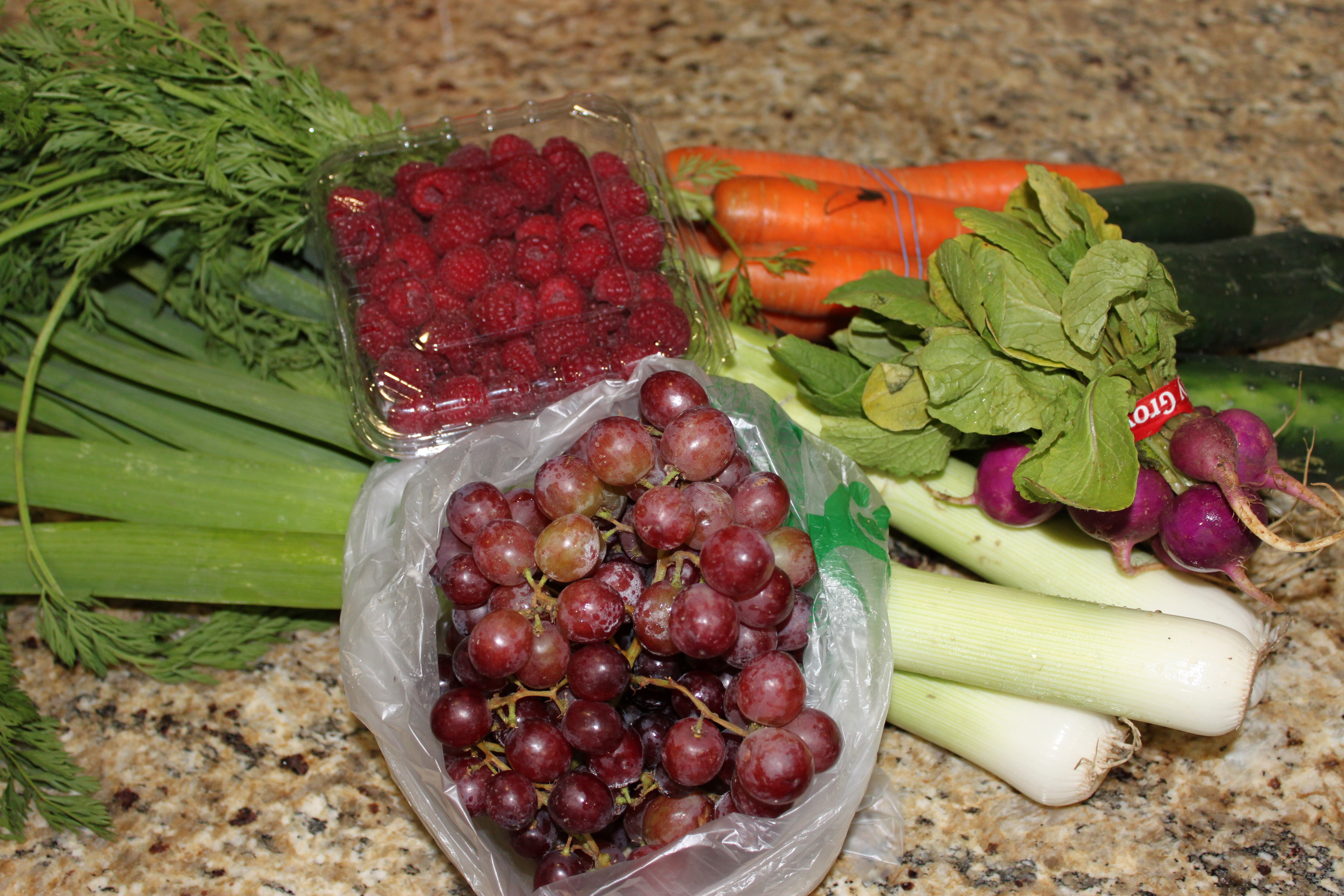 The carrots will be a great addition to my lunch to have with hummus and cucumbers are always refreshing during warm summer days. Grapes and raspberries will be my afternoon snack tomorrow!