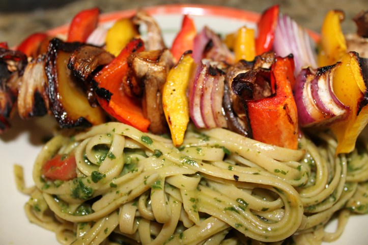 I decided to grill up some veggies on my handy-dandy griddle and serve it with a quick linguini with pesto. I wasn’t in the mood for a very heavy dinner, so opted to make this a vegan option without any cheese. It also seemed like a good idea to do in honour of Amandeep’s vegan experiment.