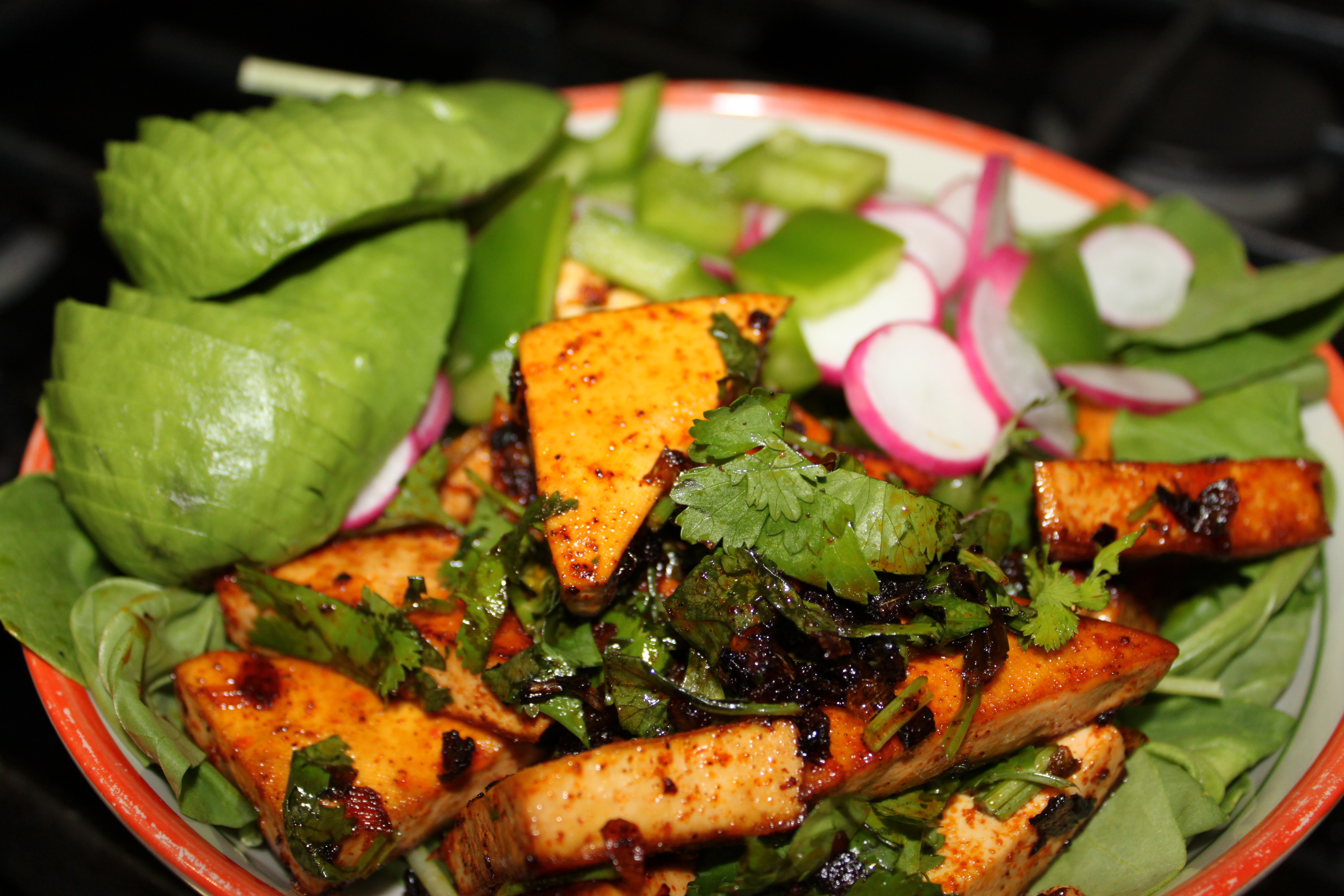 I then served this tofu on a bed of arugula, with red radishes, green peppers and avocado. My nose is still running from those thai chili peppers, but a cold refreshing glass of Santa Cruz Organics Limeade helped that situation (and was perfect for this warm summer night).
