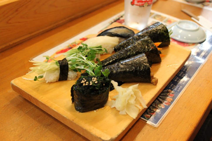 After checking out a local shrine and a couple of shops, we headed back to the sushi restaurant to pick up our friends. When we walked in, the owners quickly handed us a cup of green tea before we could tell them that we weren’t going to eat. Our friend (who conveniently could speak fluent Japanese) explained that we were vegetarian so didn’t want to eat, but the chef said he would make us a fully vegetarian meal – no dashi, no eggs, who could say no to that?