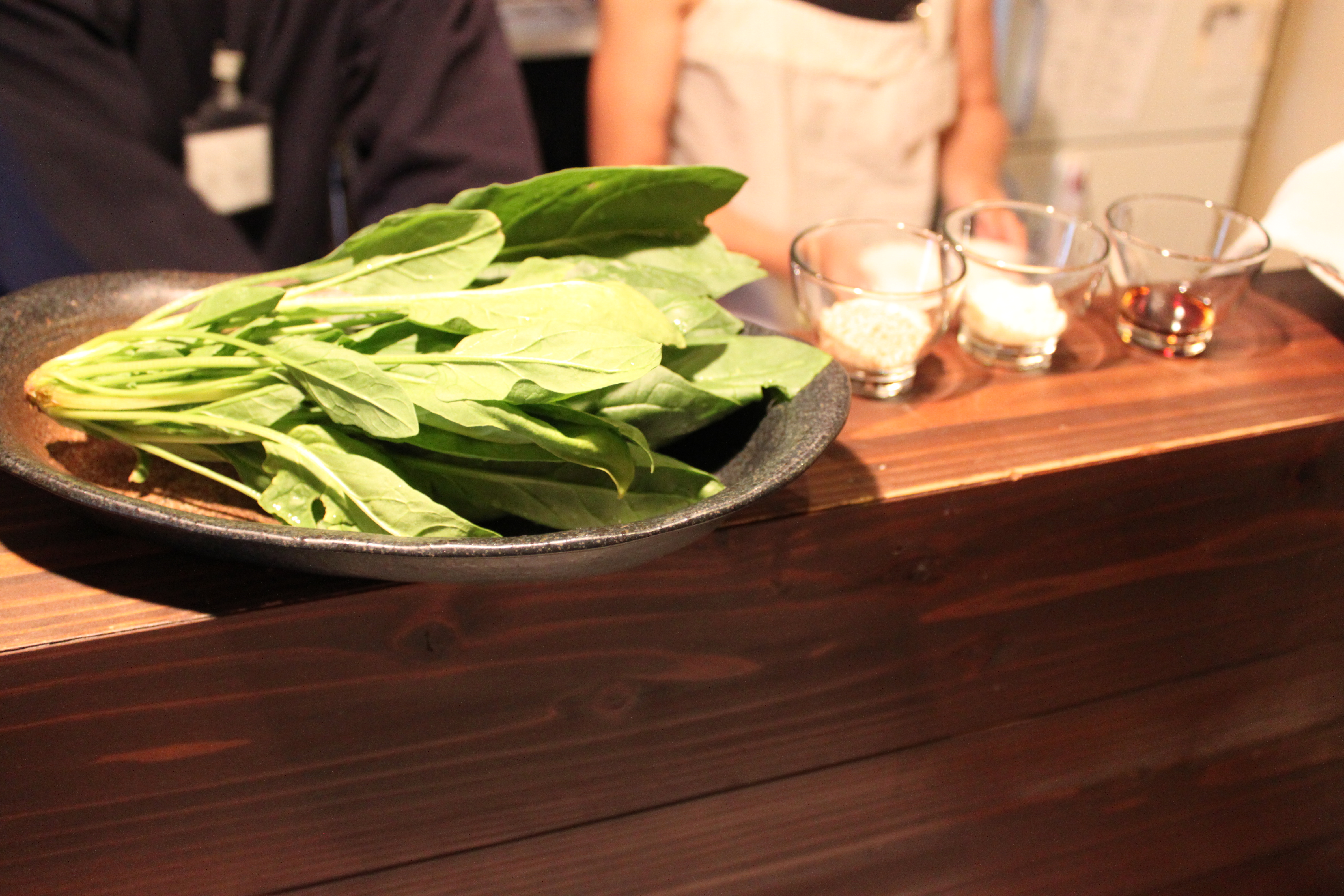 Then we started up on the spinach with a roasted sesame dressing – I’ll follow up with a recipe on a later post when I actually try to recreate this on my own. The key thing with this recipe was the quick cooking time for the spinach and the placement of the spinach on the serving plate to avoid a social disaster when trying to eat it.