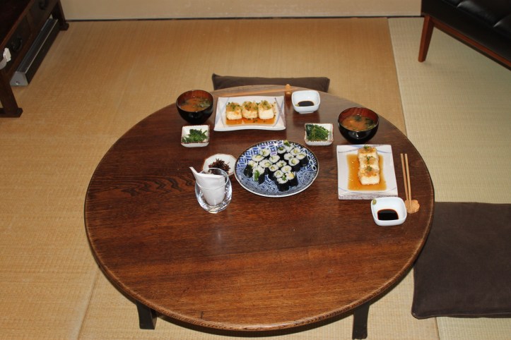 The menu we decided on was sushi (made with pickled cucumbers), agedashi tofu, miso soup and spinach – all of this was to be made obanzai style, which means home cooked style.