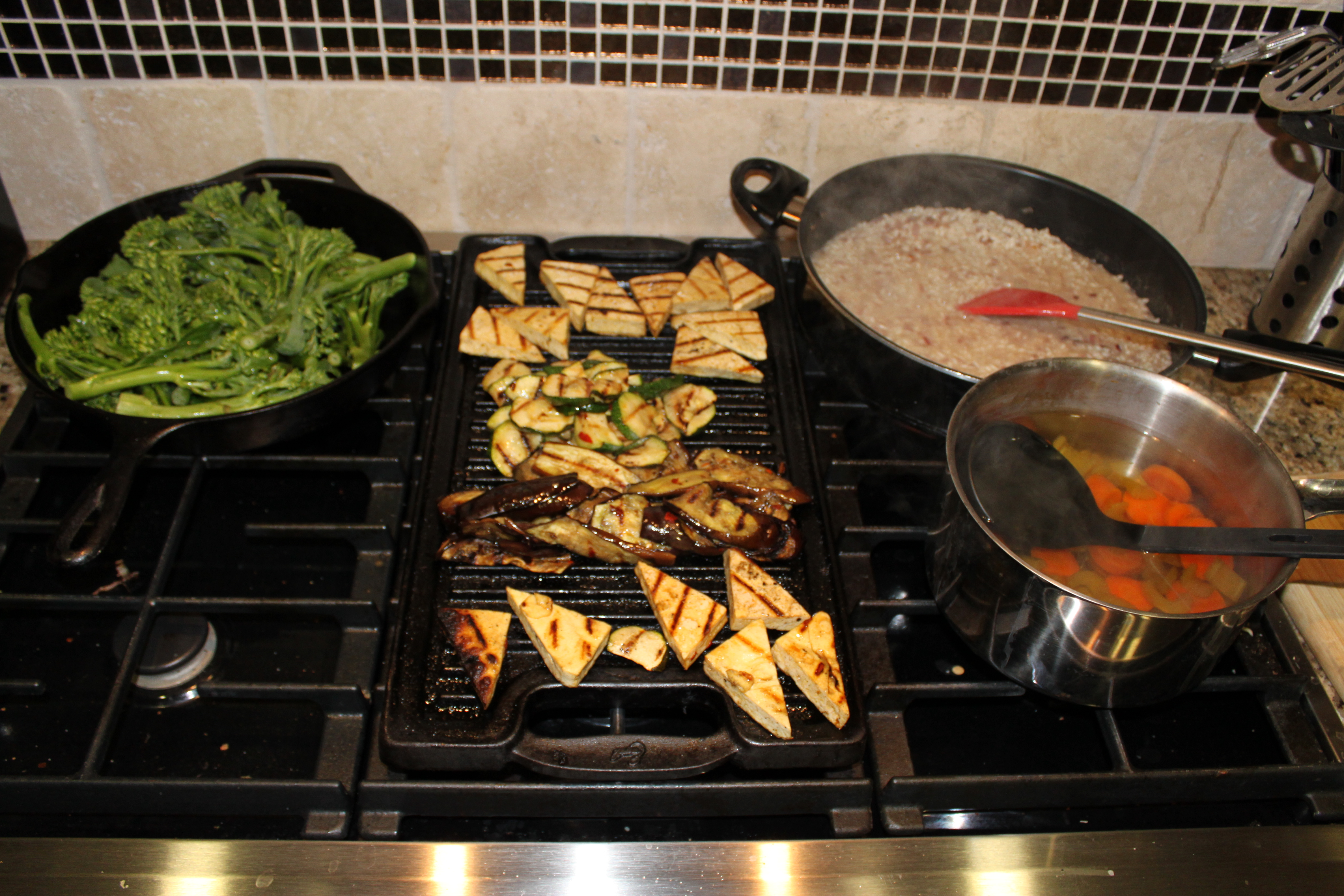 When we were getting our kitchen renovated a few years ago, our contractor asked us if we really needed to have a six burner stove in the kitchen. I should send him this picture, because five out of the six were going as I grilled up the last of the veggies and tofu (Hodo Soy, of course), sauteed sweet baby broccoli, kept the vegetable stock warm and cooked the risotto. I love six burner stoves!