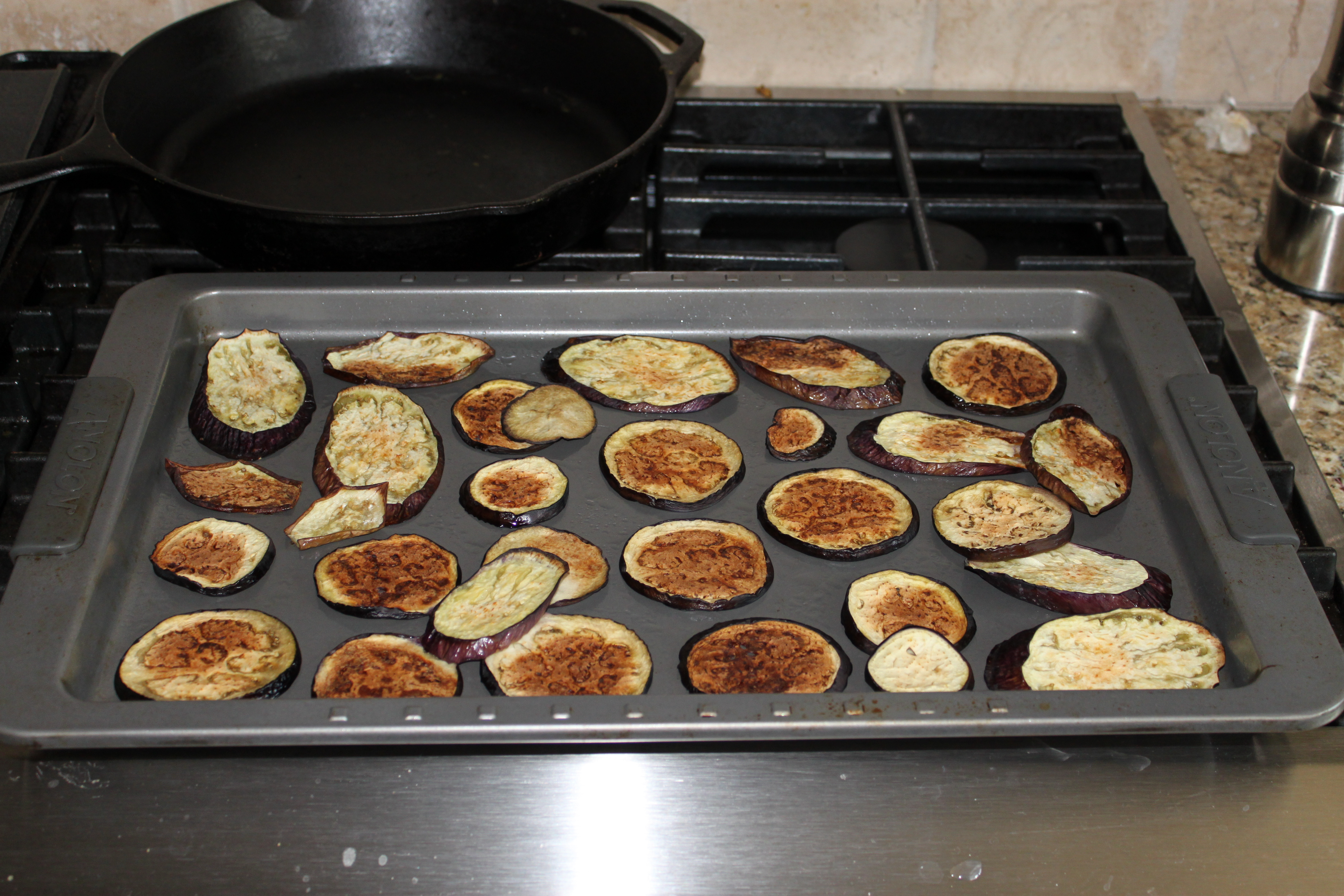 We have had an abundance of eggplant in the garden, and I decided to use this as the base for my recipe today. I started off by slicing two eggplants and roasting them in the oven.