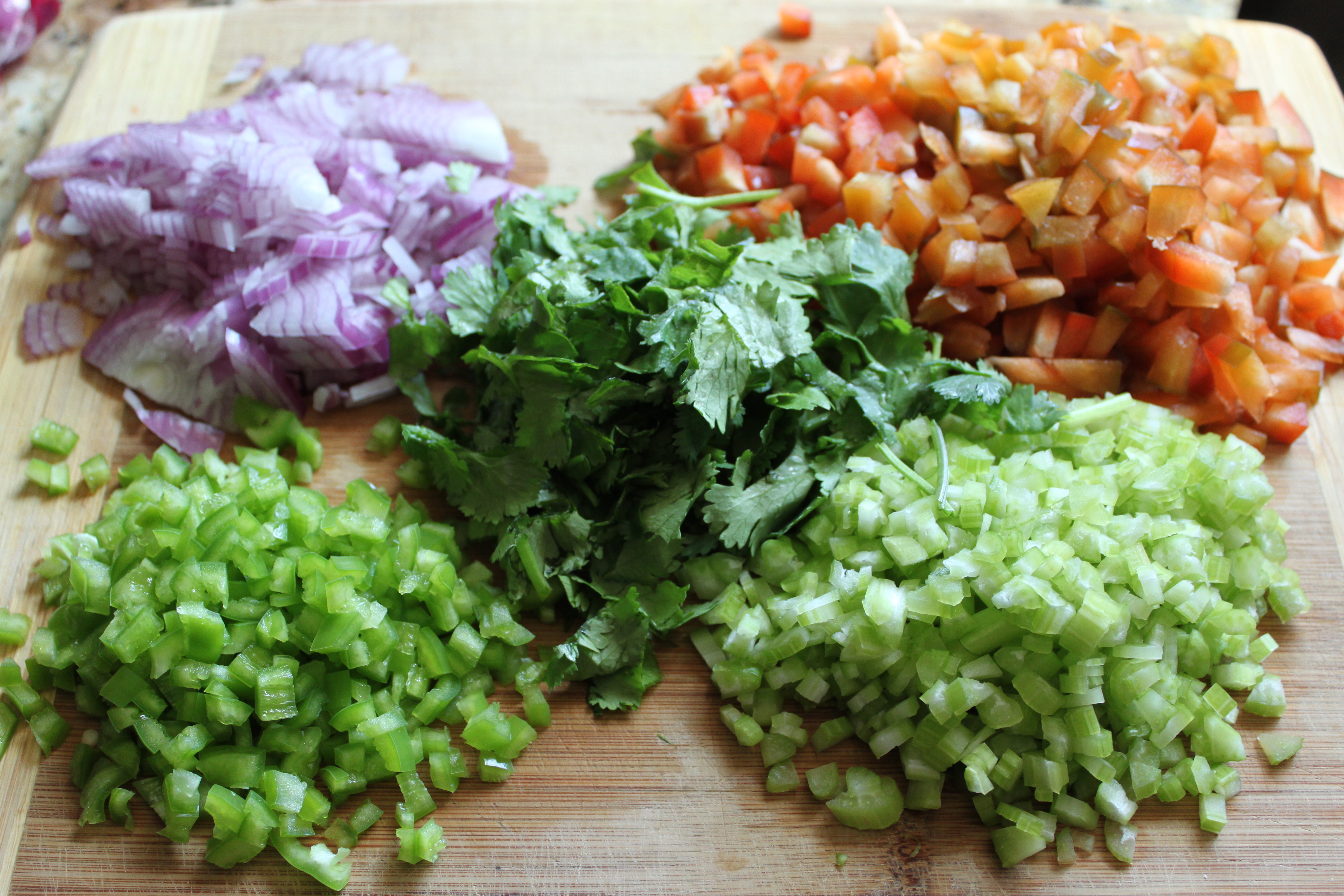 I started up by chopping up a small red onion, two stalks of celery, an italian sweet pepper, a chocolate bell pepper and some fresh cilantro.