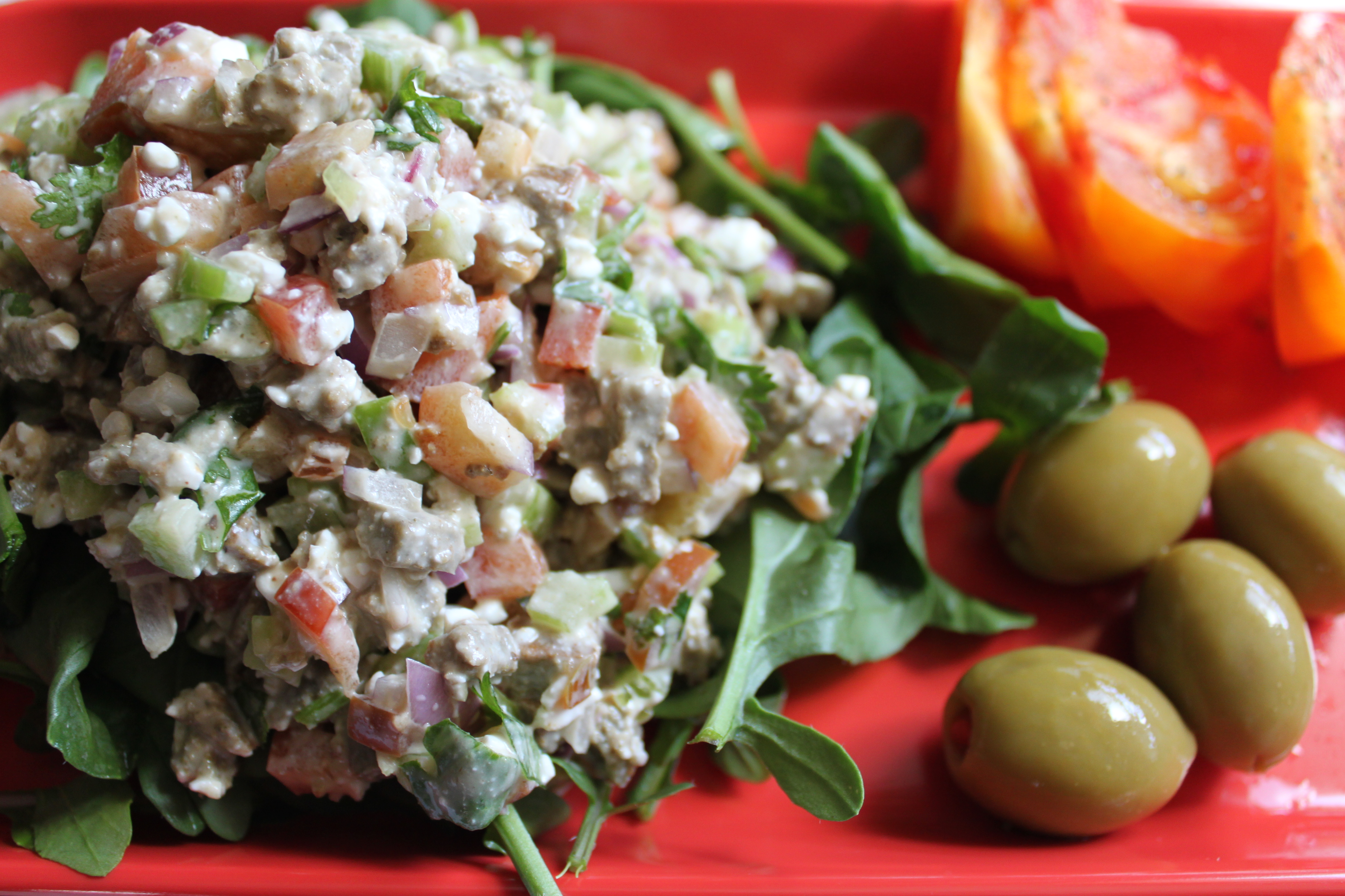 I then chopped up four muffin-pan burgers into small pieces, similar to the veggies shown above. I mixed all the ingredients in a bowl with 2 tablespoons of vegan mayo and some black and white pepper – I didn’t add any salt, because there was enough salt in the burgers and the mayo. I also added in 1 cup of cottage cheese into the mix, but you could leave this out if you wanted to keep the dish vegan. This mix was reminiscent of a potato salad or tofu salad, but had a much stronger burst of flavor with all the different veggies. Served with a fresh heirloom tomato and some green olives made this a perfect Saturday afternoon meal.