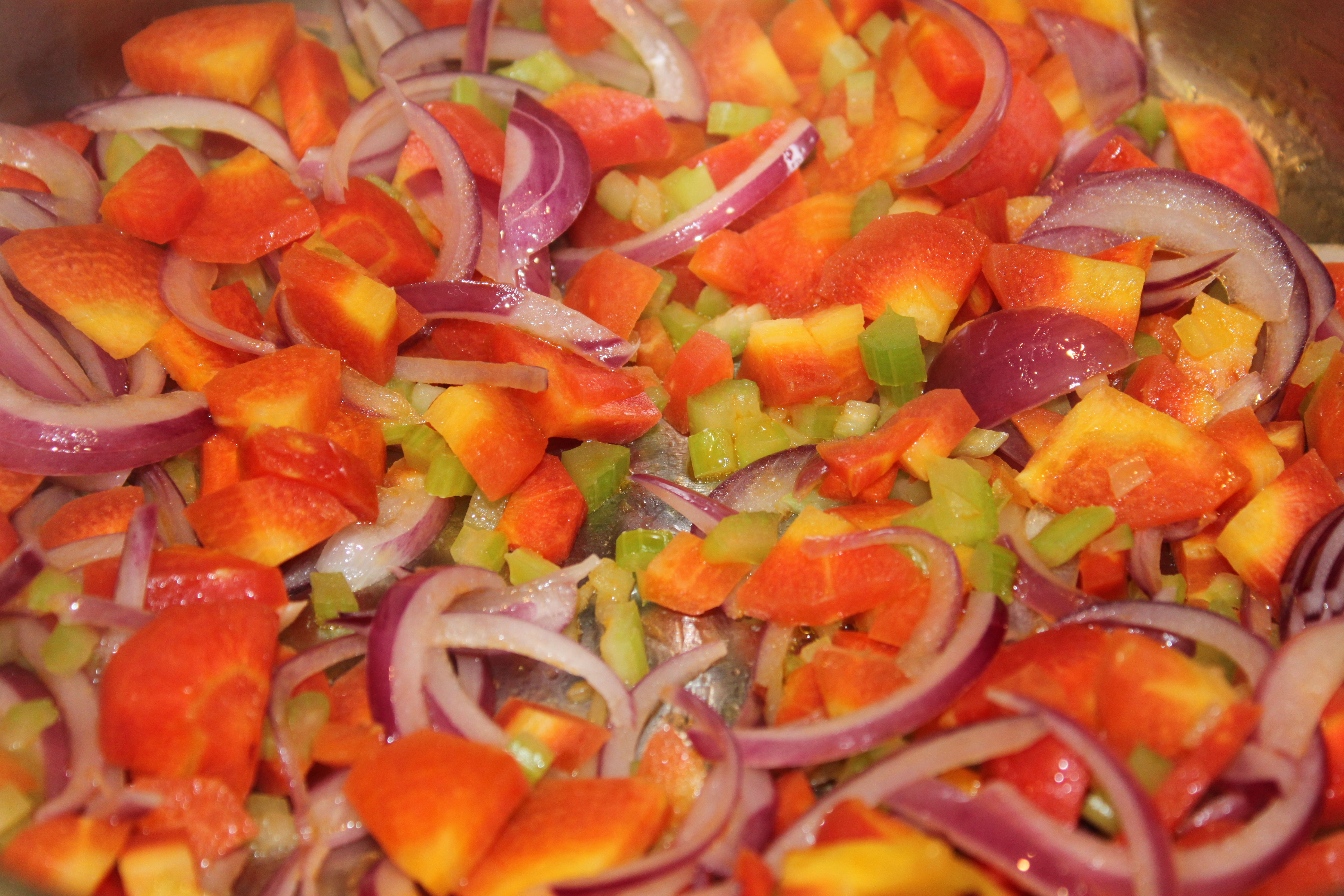 We’re back home now and I needed to make a quick dinner before all the trick-or-treaters started arriving last night, so I raided my refrigerator and pulled out all the veggies I could find. I started by cooking up a mirepoix (1 red onion, 1 stalk of celery and 4 carrots from my garden) – no, those aren’t tomatoes in the picture below – it is actually the colour of the beautiful carrots.