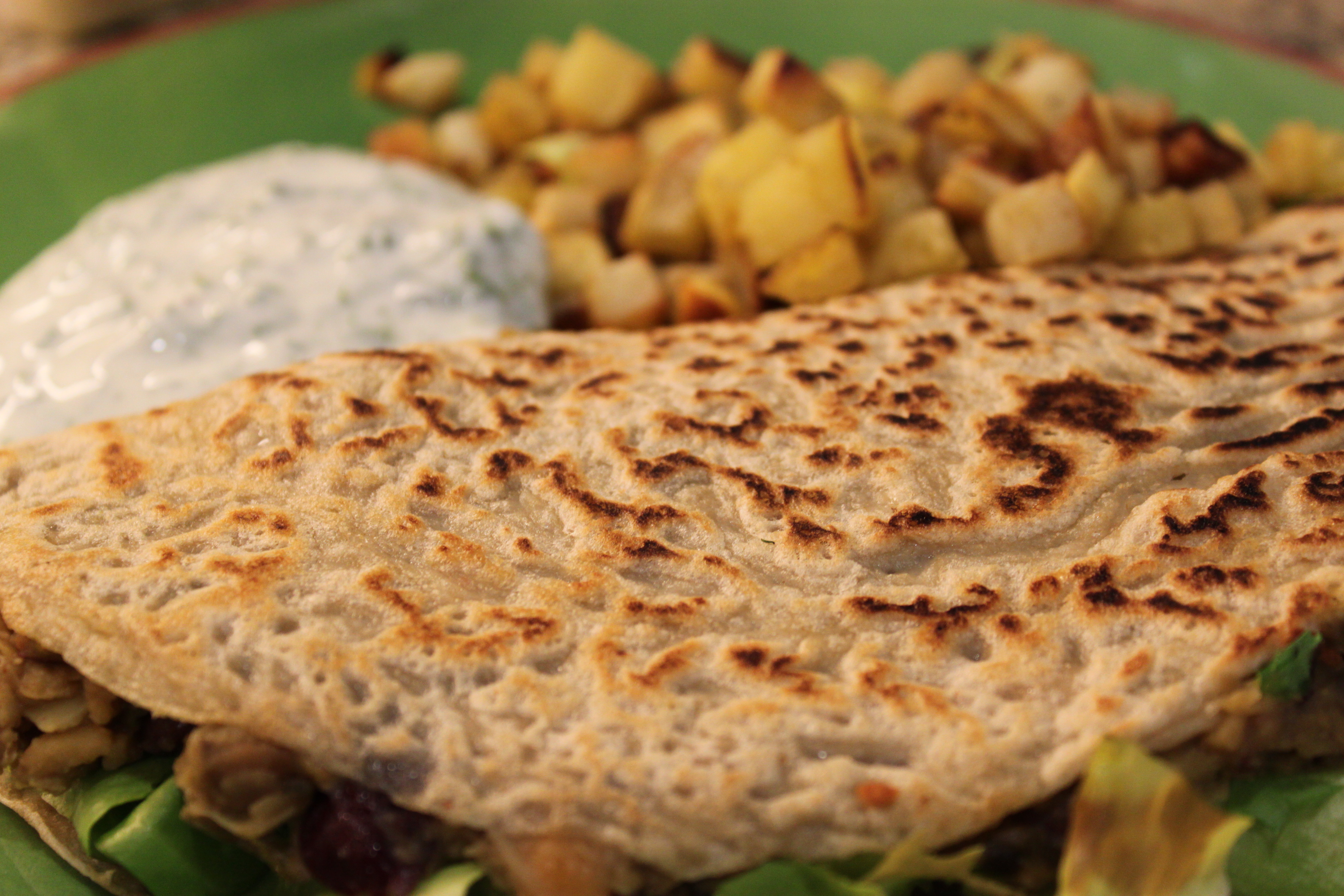 Back to my leftovers project – I had the soup and taco filling, which I decided to mix together and simmer down until the mixture had thickened. The soup was a pretty basic lentil soup, so didn’t have any strong flavors which is why it worked out well with the taco filling. I then whipped up some savory crepes by modifying the whole wheat crepe recipe from Isa Chandra Moskowitz‘s cookbook Vegan Brunch. I filled the crepes with some sharp cheddar, the leftover mixture and some escarole and served them along side some pan fried potatoes and a yogurt-dill sauce (with fresh dill from our garden – yummy!). I also think this is a much healthier alternative to buying tortillas for quesadillas (besides, I can never use up a full package of tortillas in a week, and this way, I’m making only as much as I can actually consume).