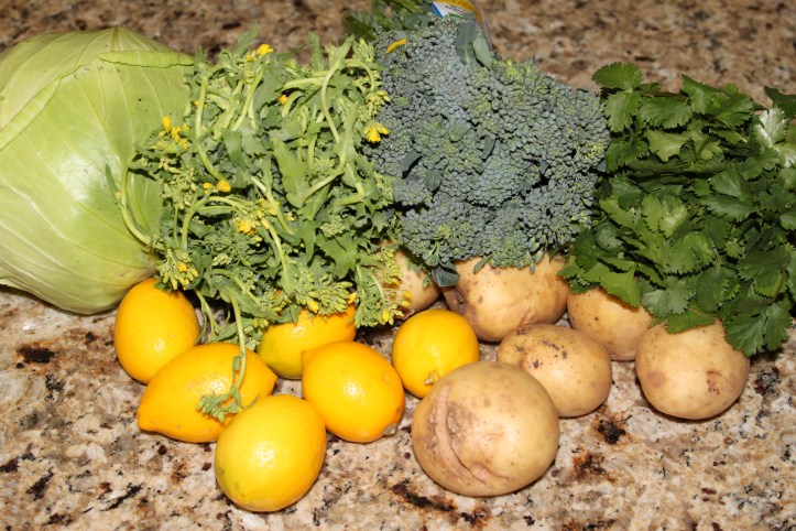 I was so excited to see baby broccoli as an offering again – I think it might be one of my favourites.  I rounded up the delivery with cabbage (which I used tonight already in a lemongrass stir fry), Yukon Gold potatoes (which are destined for goodness) and cilantro (I have some starting to grow in the garden already, which is pretty exciting).