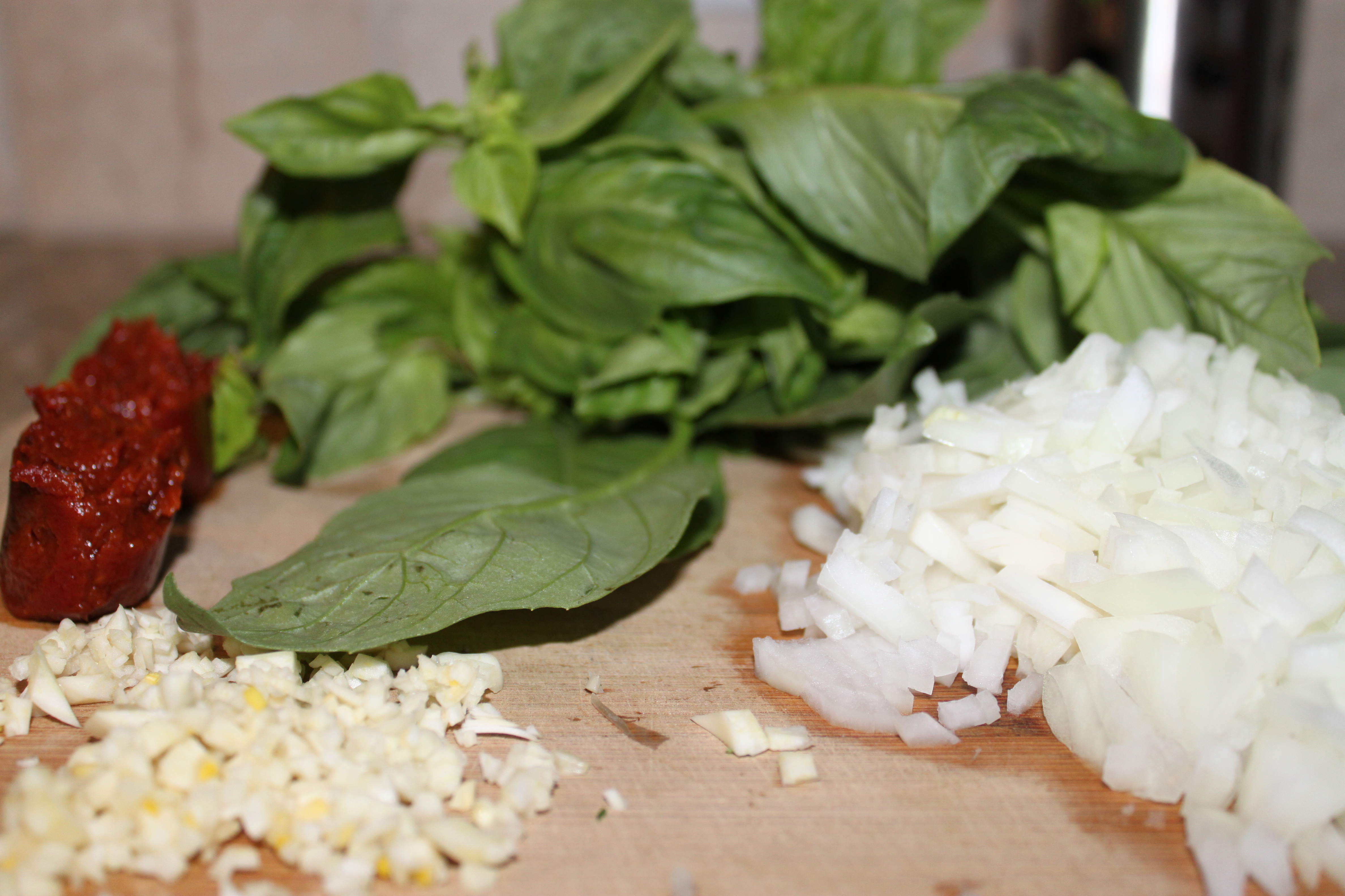 I had a fresh bunch of basil from my CSA delivery last week – I decided to make a tomato basil sauce to serve with whole wheat spaghetti. I used onion, lots of garlic, homemade tomato paste (from my freezer) and fresh basil as the main ingredients in this recipe.