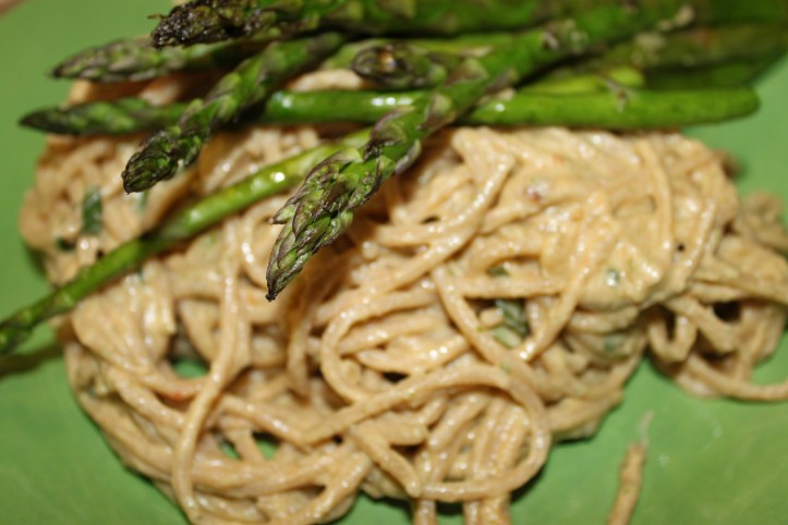 I served the pasta with some grilled asparagus we picked up at the new San Jose Farmer’s Market at San Pedro Square – it’s nice to know that we have another option if we can’t make it to our regular farmers market on Sunday.