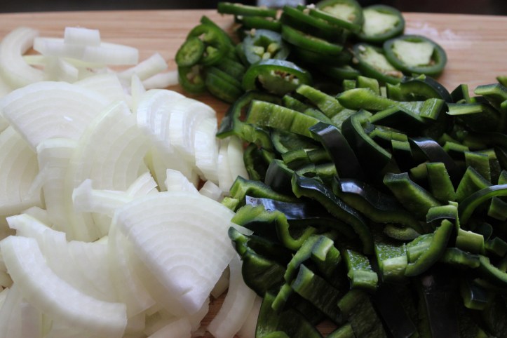 - Prep the onions, poblanos and jalapeños by cutting them into thick slices. Mince the garlic.